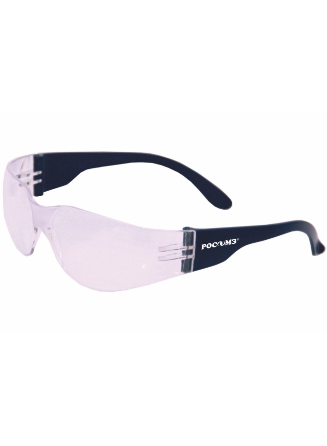 Панорамные линзы, два уровня защиты: фронтальный, боковой. Дужки одноцветные черные, без регулировки, заушники широкие.