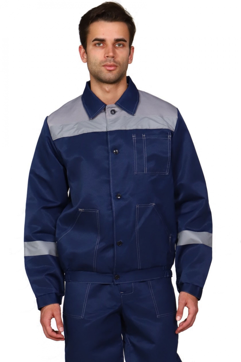 ➠ Куртка: укороченная, с притачным поясом. Центральная бортовая застежка на петли и пуговицы. Воротник отложной. Один левый нагрудный накладной карман с отделением для карандаша или ручки. Два нижних накладных кармана с наклонным входом. Рукава с манжетами, застегивающимися на пуговицу, с налокотниками. Притачной пояс с участками эластичной тесьмы по бокам. По шву притачивания кокетки и по рукавам СОП 50 мм.